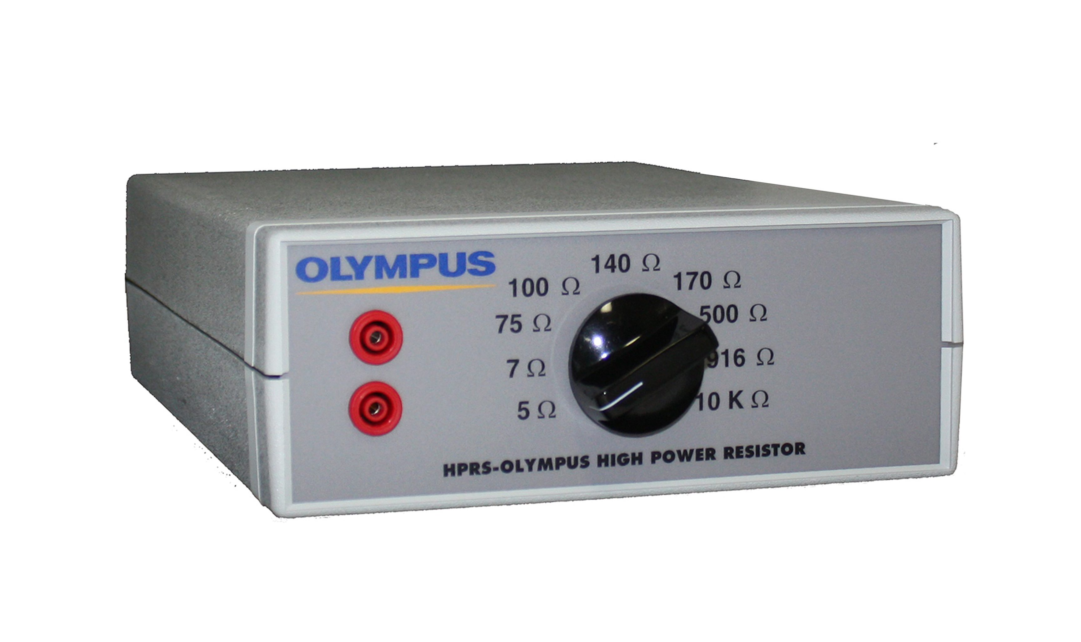 Olympus ECG Test Box IET Labs created a custom resistive load box in a non-conductive portable box. The portable box allows the service technician to switch between the various resistance required via a rotary switch. The low inductance resistors are mounted on a custom machined heatsink designed to dissipate up to 500 W. The front panel utilized a custom overlay with Olympus supplied logo. A thermal switch was also mounted to the heatsink just in case temperature limits were exceeded on the heatsink.