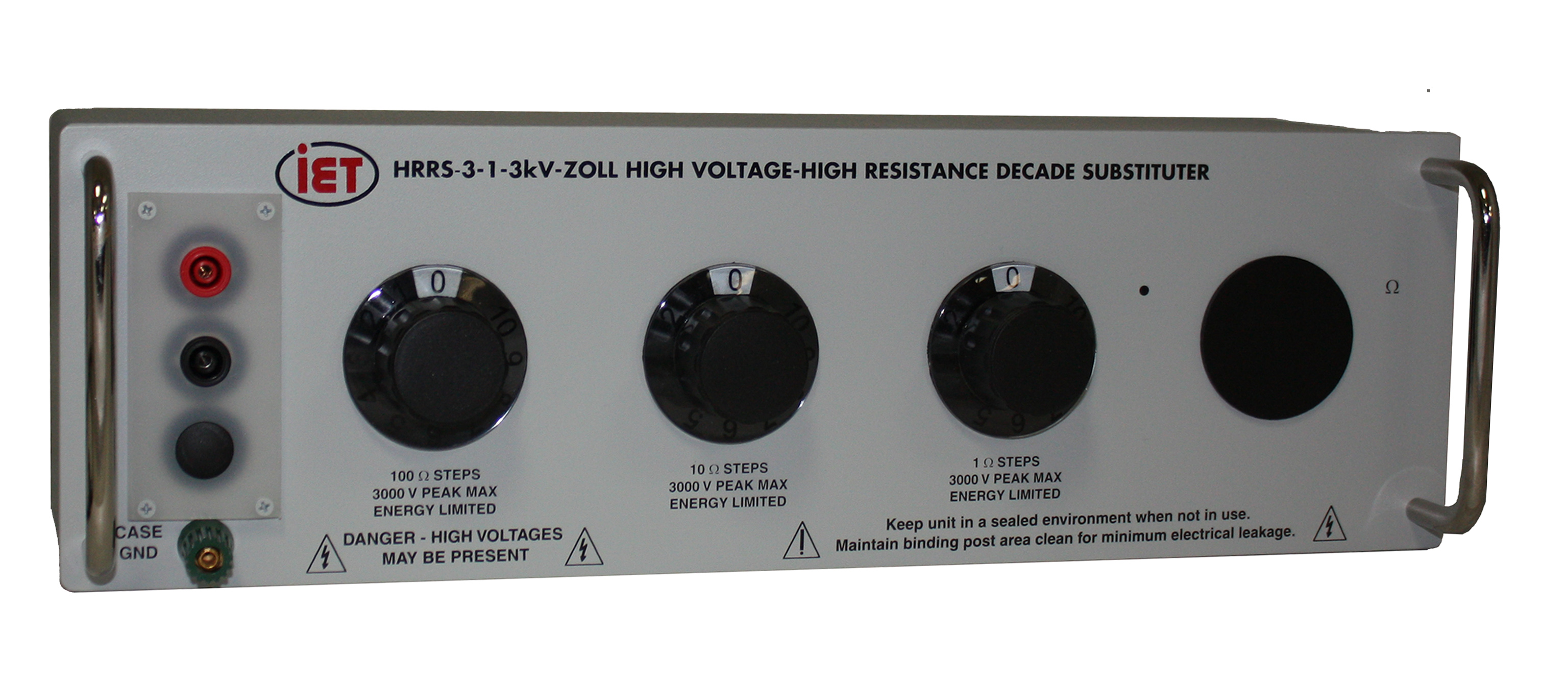 IET Labs HRRS-F-3-1-3kV-Zoll IET Labs created a custom high voltage decade resistance box. The decade resistance box was based upon our HRRS series panel and switches that are designed to handle up to 10 kV dc. Tubular power resistors were utilized to provide the required power. 4 mm panel mount banana jacks were used and accept sheathed banana plugs for safety. The banana jacks are mounted in a Kel-F plate to handle the higher voltage and minimize leakage to the chassis.