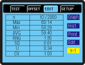 - Data Editing/ Statistic Data (Test Times/ Max./ Min./ Mean/ Range/ Standard Deviation/ Dispersion/ Coefficient of Variation)/ Graph Chart Display/ Histogram Display