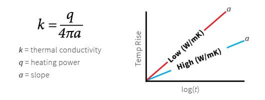 The Transient Line Source (TLS) meter follows ASTM D5334-14. The sensor needle consists of a thin heating wire and temperature sensor sealed in a 100 or 50 mm steel tube. The sensor is completely inserted into the sample to be tested. Heat is delivered to the sample using a constant current source (q) and the temperature rise is recorded over a defined period of time. The slope (a) from plot of temperature rise versus logarithm of time is used in the calculation of thermal conductivity (k). The higher the thermal conductivity of a sample, the lower the slope. For samples of low thermal conductivity, the slope will be higher.