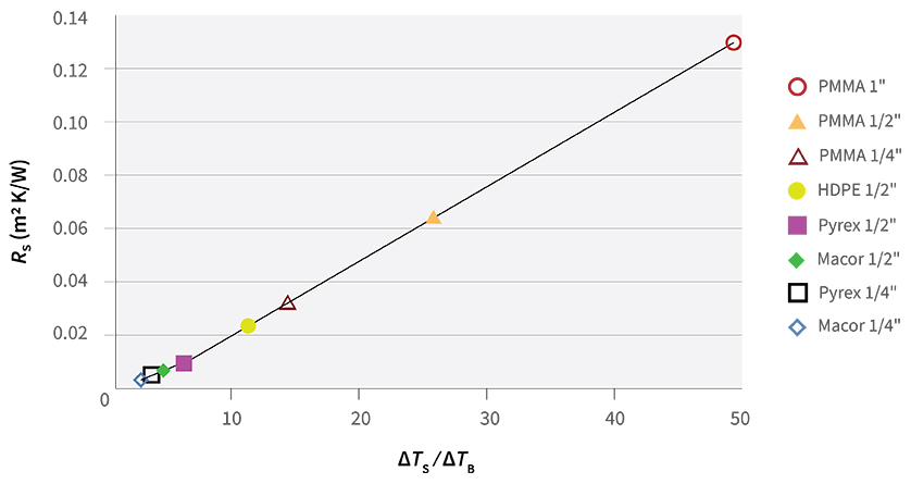 Once steady-state temperature across sample is achieved, the Fourier law equation can be applied. It can readily be shown that for any solid sample, the ratio RS (m2 K/W), equal to the thickness of the sample, d (m), to its thermal conductivity, λ (W/mK), can be obtained from the temperatures measured: