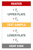 The testing stack is made up of a heater – upper plate, with integrated temperature sensor and heat sink – lower plate with integrated temperature sensor on each side of the sample. Additional temperature sensors are placed near the top and bottom surface of the sample.