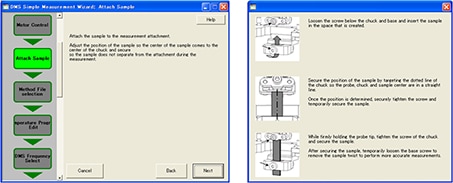 The Simple Measurement Wizard in the TA7000 software provides step-by-step navigation from setting measurement conditions to the start of a measurement. The operation procedure is shown with easy-to-understand illustrations which help in setting up suitable measurement conditions and starting a measurement without mistakes.