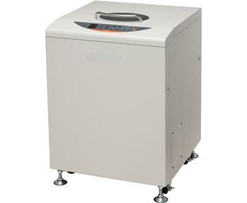 This product employs a twin mixer system, and supports manufacturing application with the capacity to process a maximum 1L of materials. It is equipped with a vacuum function in order to achieve deaeration at the submicron level, thus it is possible to process uniform mixing and dispersion as well as deaeration at the same time. It has two deaeration modes as standard features: one is vacuum deaeration mode which combines 400G centrifugal force and vacuum, and the other is Non Vacuum deaeration mode which utilizes powerful centrifugal force of maximum 670G. This enables high precision deaeration even with materials that contain a volatile component that is not suitable for vacuum deaeration. Furthermore, time to reach vacuum is significantly reduced by adopting our unique in-cup-holder vacuum pressure reduction system that minimizes the vacuum volume.